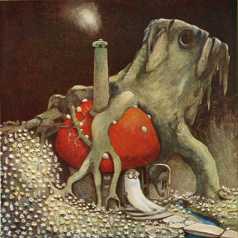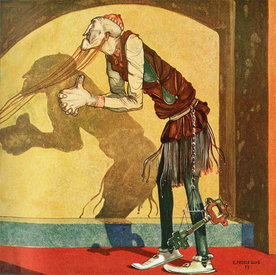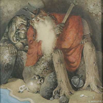 Einar Norelius föddes i dalarna år 1900 och avled i sitt hemlandskap 84 år senare 1985. Den begåvade Norelius studerade först vid Tekniska högskolan, men senare även måleri. Konsten tog över och Norelius blev vid sidan av John Bauer vår mest kände sagotecknare. En viktig skillnad mellan de två konstnärerna är att Norelius motiv är mer lekfull och präglas av en hel del humor. Inte bara illustrationer till sagor gjordes, Norelius skrev en del också. Som serietecknare kan nämnas att Norelius gjorde bilderna till den första serien om Pelle svanslös och sin egen serie om ”Dumbo i djungeln”. Det viktigaste gärningen var dock den att Norelius gjorde illustrationerna till ”Bland tomtar och troll” i 53 år. Många har sett hans bilder men kanske inte funderat så mycket på vem som gjort dem. Norelius var även med i Konstnärernas riksorganisation och var grundare föreningen Svenska tecknare.