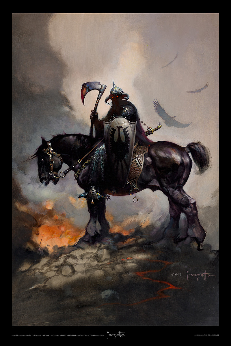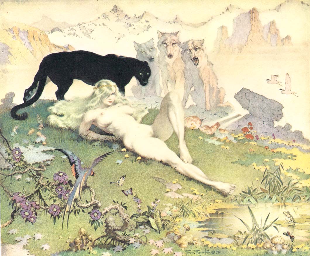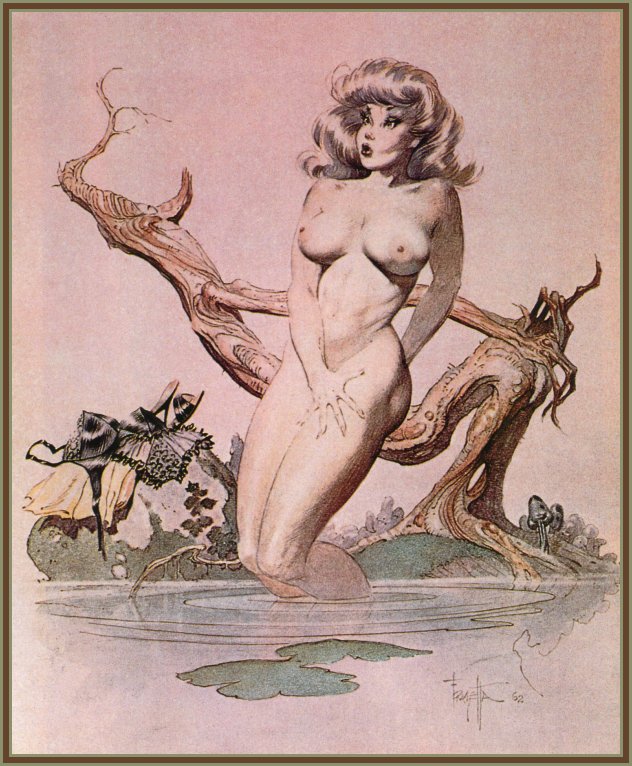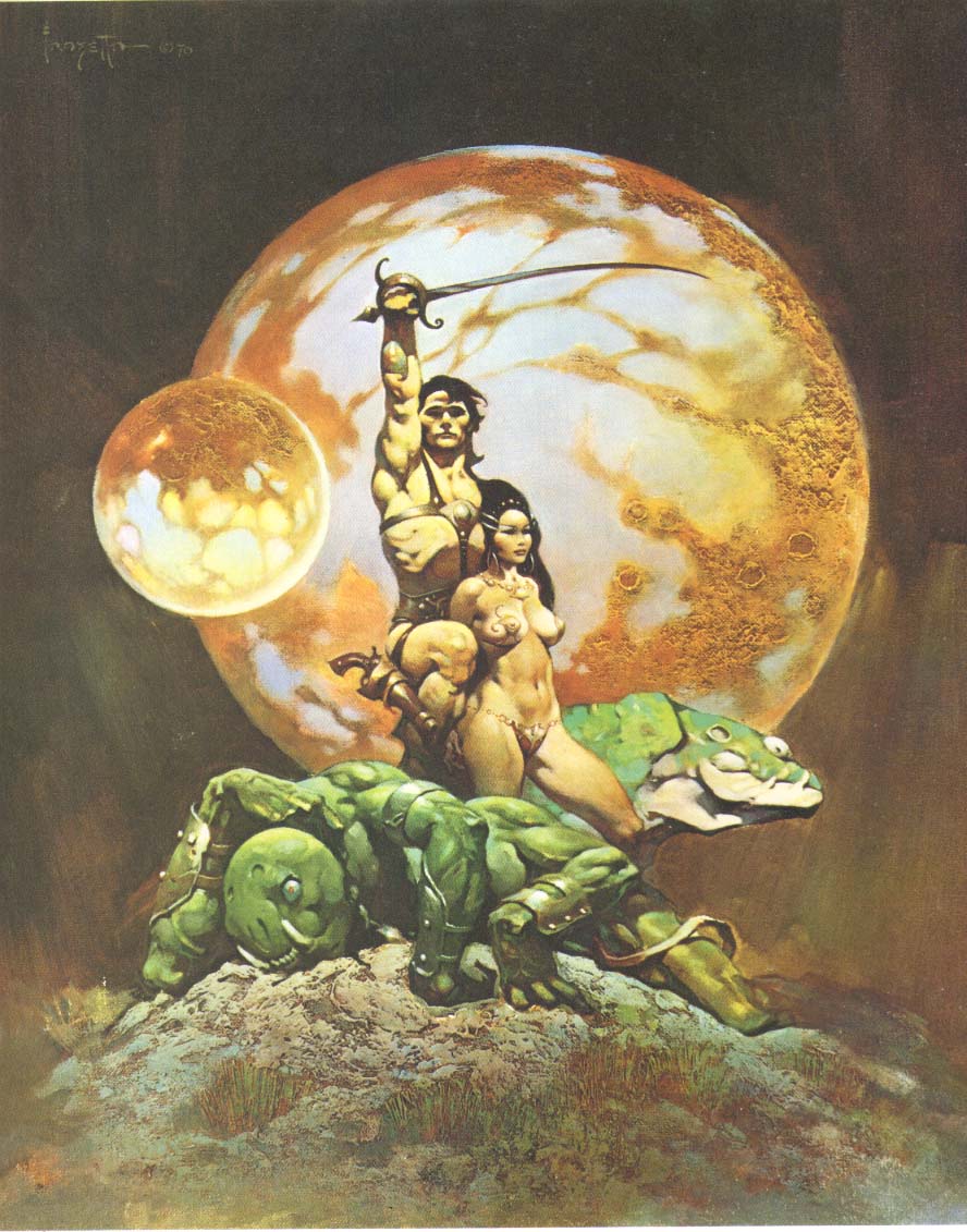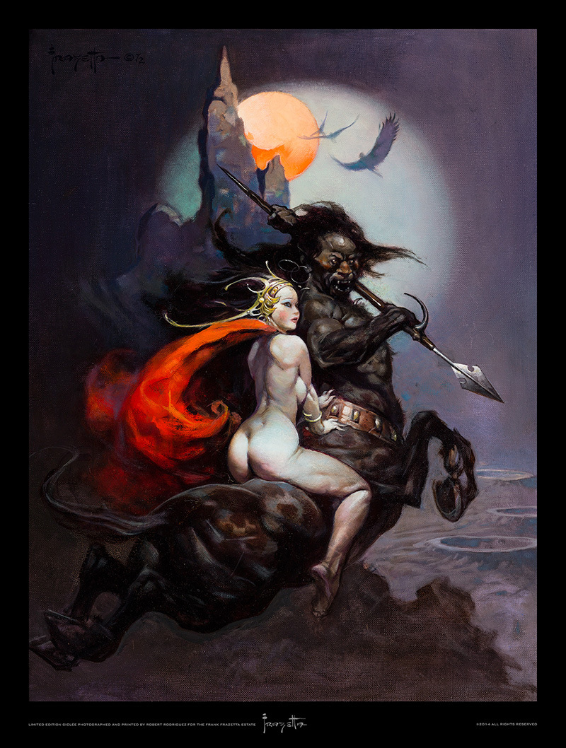 Frank Frazetta, föddes 9 februari 1928 i Brooklyn, New York, och såg döden 10 maj 2010 i Fort Myers, Florida, USA. Frazetta började som så många andra som är konstnärligt intresserade rita och teckna i barnåren och redan som sextonåring började han försörja sig på sin konst. En nästan oräknelig produktion av omslag till böcker, serietidningar och LP-skivor gjordes, men även arbeten till filmindustrin. Frank Frazetta gifte sig med Elenor Kelly som ofta blev avporträtterad, även på skoj lät ibland hennes make måla in sig själv i de målningar och i ett verk är han målad som kentaur och hon ridande på hans rygg. Fru Frazetta var ofta den som skötte makens ekonomi och tog hand om den affärsmässiga delen av beställningarna som kom in. Mycket av illustrationerna är inom genre som fantasy, skräck och science fiction. Många av damerna som Frazetta målade fick ganska väl tilltagna sättesmuskler…