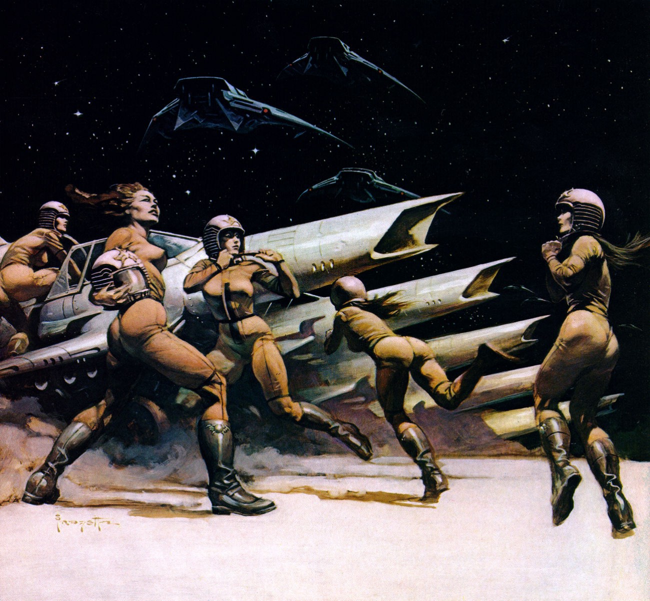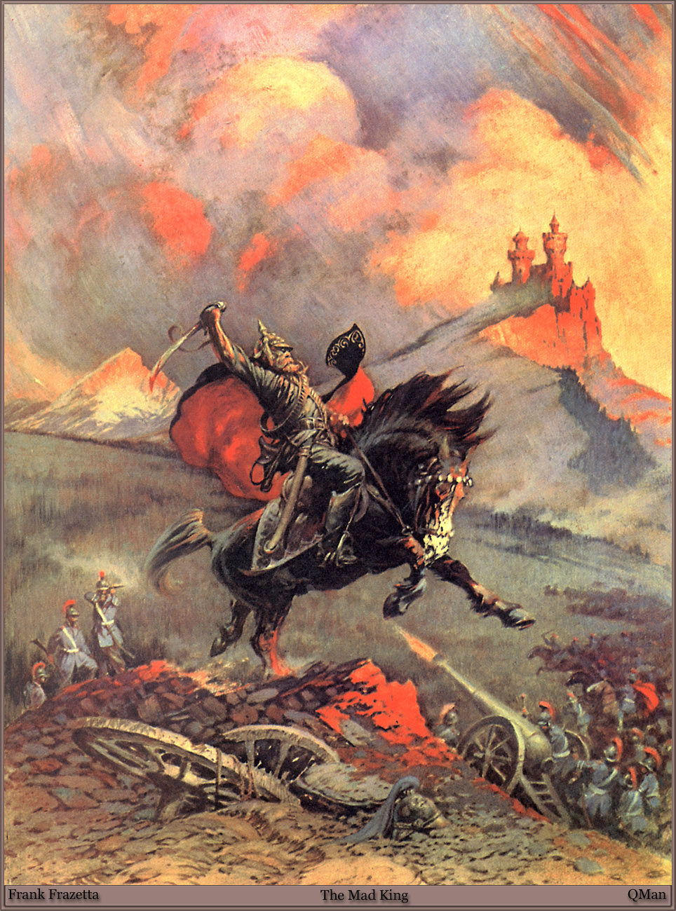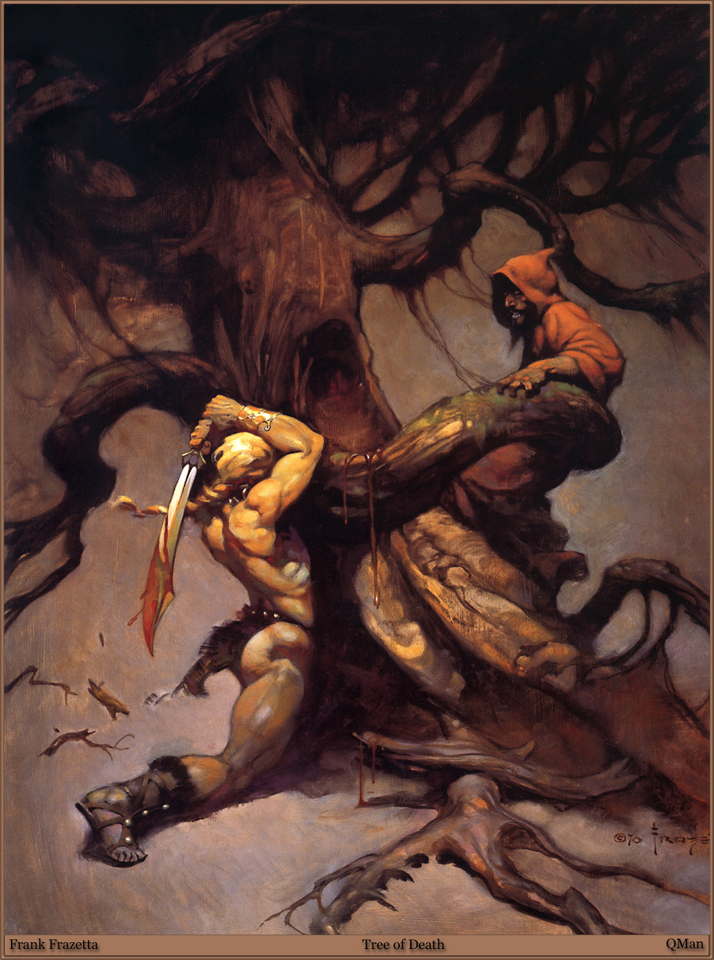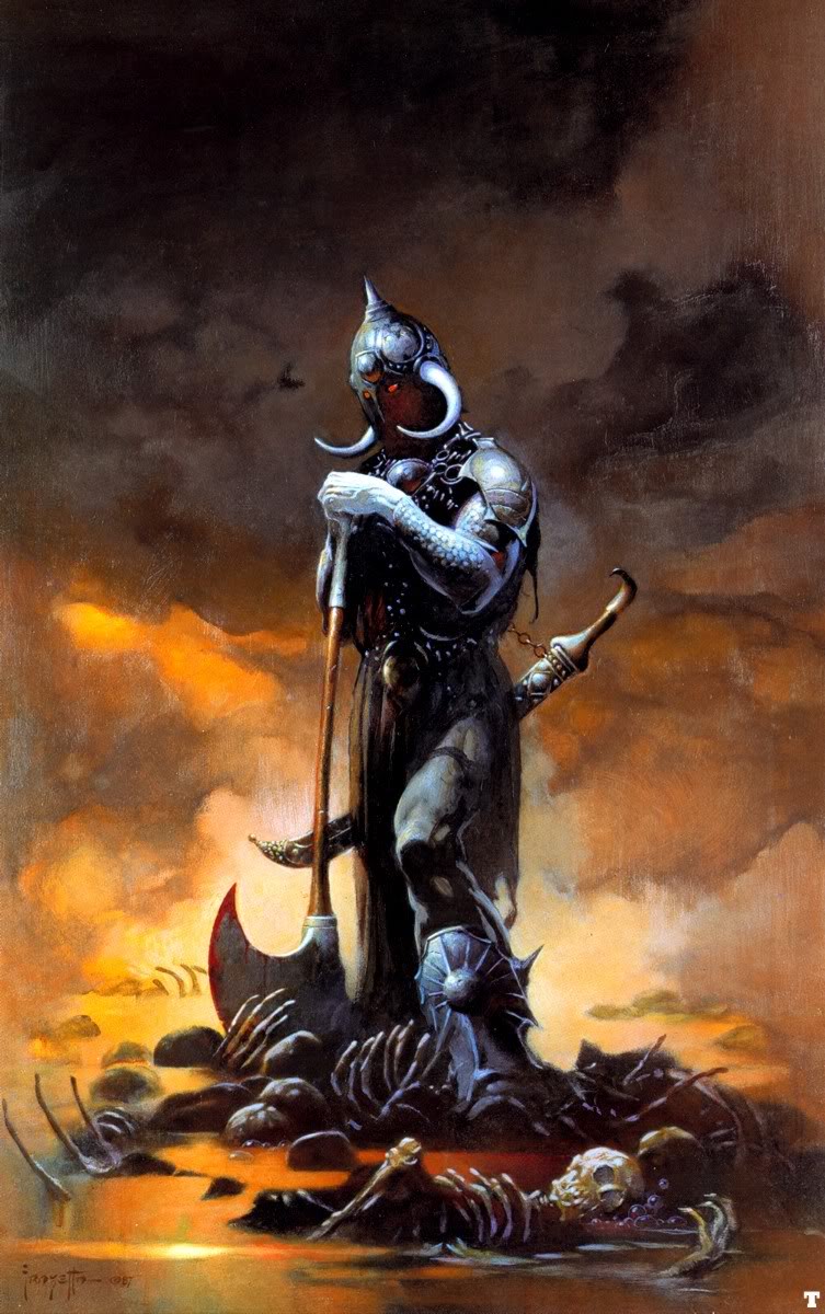 Frank Frazetta, föddes 9 februari 1928 i Brooklyn, New York, och såg döden 10 maj 2010 i Fort Myers, Florida, USA. Frazetta började som så många andra som är konstnärligt intresserade rita och teckna i barnåren och redan som sextonåring började han försörja sig på sin konst. En nästan oräknelig produktion av omslag till böcker, serietidningar och LP-skivor gjordes, men även arbeten till filmindustrin. Frank Frazetta gifte sig med Elenor Kelly som ofta blev avporträtterad, även på skoj lät ibland hennes make måla in sig själv i de målningar och i ett verk är han målad som kentaur och hon ridande på hans rygg. Fru Frazetta var ofta den som skötte makens ekonomi och tog hand om den affärsmässiga delen av beställningarna som kom in. Mycket av illustrationerna är inom genre som fantasy, skräck och science fiction. Många av damerna som Frazetta målade fick ganska väl tilltagna sättesmuskler…