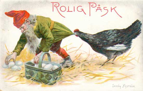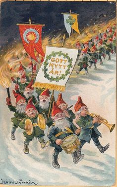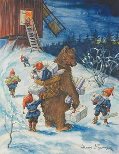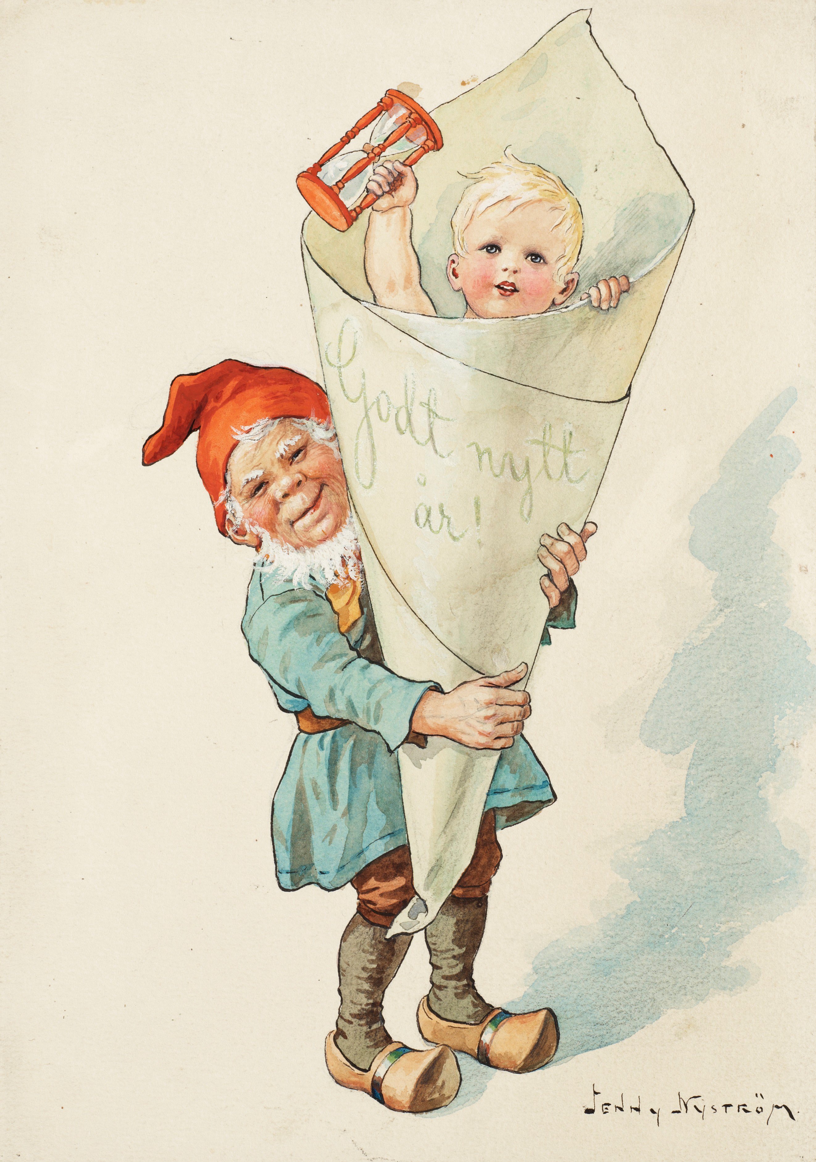 I Kalmar föddes 1854 Jenny Nyström. När hon fyllde åtta år flyttade hennes familj till Göteborg. 1865 började unga Jenny på Göteborgs Musei Riskola. 1882-1886 studerade vår konstnärinna i paris, vilket var ovanligt för flickor men Jenny visade sig ha stor talang. Åter i Sverige gifte hon sig med en herre vid namn Daniel Stoopendaal. Hon lade till hans namn till sitt men det är ju som Jenny Nyström hon har gått till eftervärlden. 1800-talets senare period då det gäller måleri handlade mycket om just historiemåleri och Jenny Nyström illustrerade och målade motiv från fornnordisk och svensk historia. Men det var genom att illustrera Viktor Rydbergs ”Lille Viggs äventyr på julafton” 1871 och ”Tomten” 1881 som blev början till det som vi förknippar Jenny Nyström med. För vad är det Jenny Nyström är känd för? Jo tomtar. Hur många tomtar hon illustrerade må de lärda tvista om med de är många. Tomtar i böcker, tomtar i annonser, tomtar på julbonader och tomtar på julkort. Till detta ska sägas att det tillkom en hel del andra kort med nyårs och påskmotiv. Maken Daniel blev sjuk och det var frun som fick sköta hus och hem, de fick en son som gick i moderns spår och illustrerade han med. Jennys tomtar blev snabbt populära och är det ännu idag. Troligen har alla hushåll i Sverige något motiv med Jenny Nyström. Trots att tomtemålandet blev något av en massproduktion släppte Jenny Nyström aldrig den rent konstnärliga skärpan. Hon fick aldrig tomtar på loftet som man säger. 1946 avled i januari tomtens främste avbildare.