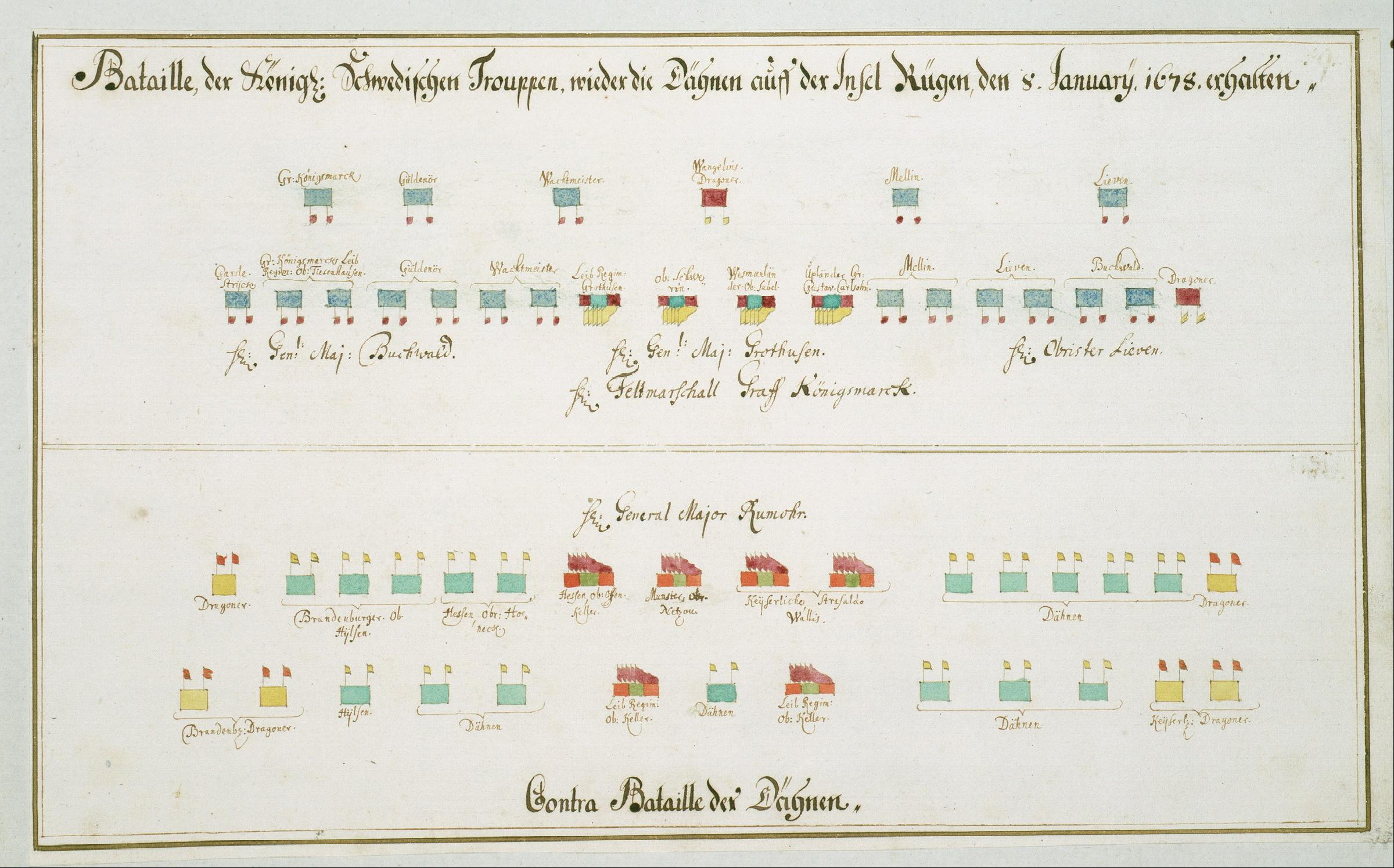 Rügen, en ö som tillfälligt Sverige efter segern i trettiåriga kriget hade invaderats av danska och brandenburgska trupper. Svenskarna leddes av fältmarskalk Otto Wilhelm von Königsmarck.