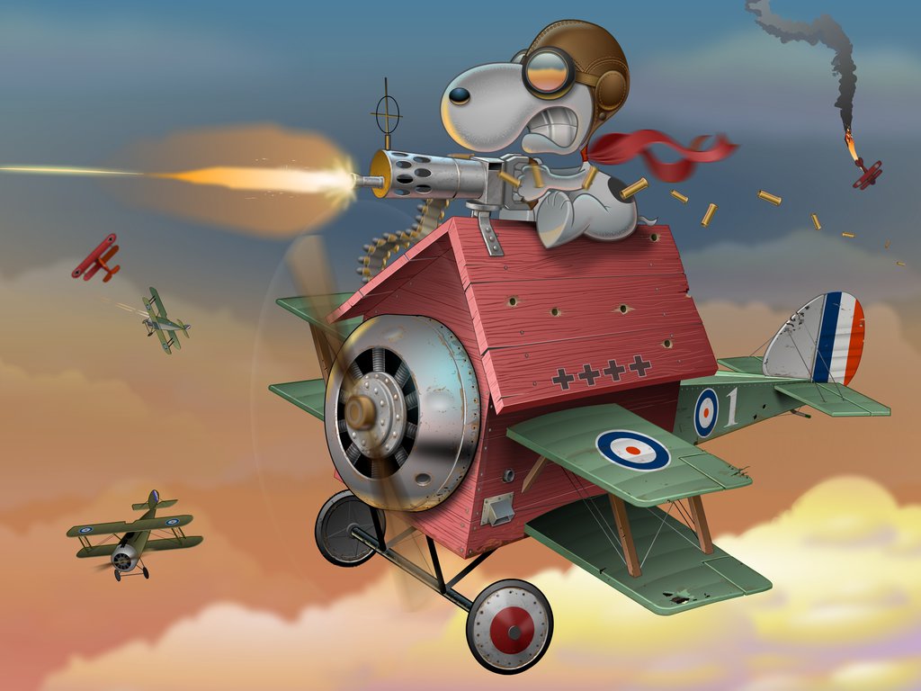Vi avslutar med Snobben. Ofta leker Snobben att han är en flygarhjälte under första världskriget. Här verkar karaktären Snobbe inom sin handlingsram, men hundkojan påminner nu om ett flygplan.