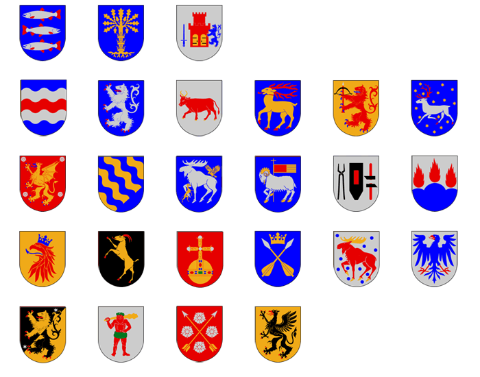 Ångermanland, Blekinge, Bohuslän, Medelpad, Halland, Dalsland, Öland, Småland, Västerbotten, Östergötland, Norrbotten, Jämtland, Härjedalen, Västmanland, Skåne, Hälsingland, Uppland, Dalarna, Gästrikland, Värmland, Västergötland, Lappland, Närke och Södermanlands vapen.