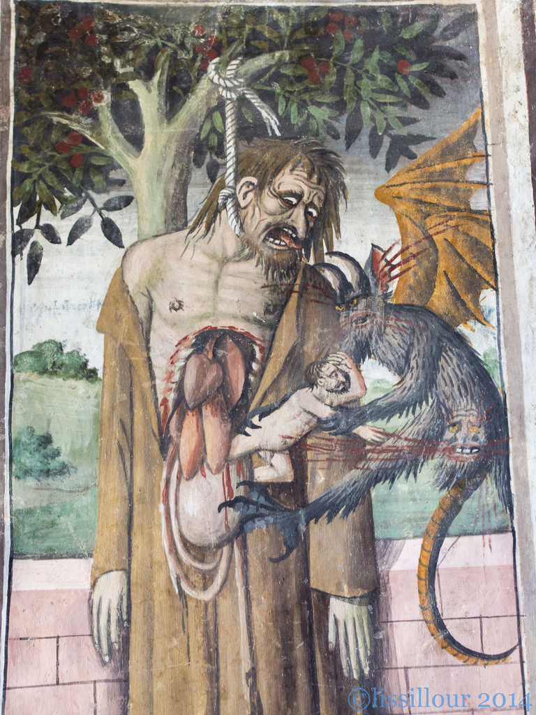 Hemsk bild, eller hur? Judas har gått och hängt sig. Det är inget kejsarsnitt som sker på bilden. Nej et är Hin Håle själv som hämtar Judas själ. Skälet till att Djävulen stjäl Judas själ är att denne man och före detta lärjunge svikt sin herre. Judas sålde sig billigt, 30 silverpenningar. Vad får man för 30 spänn idag? En halv grillad kyckling eller en timmes parkering i en större stad.