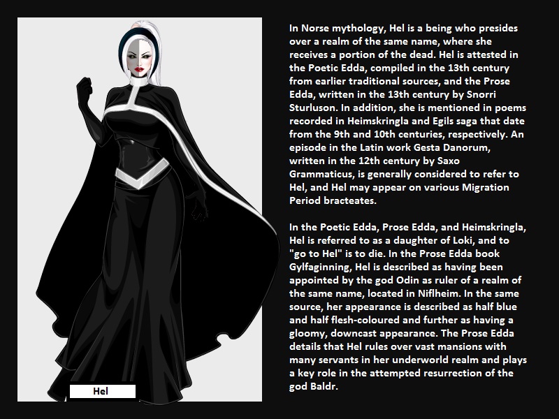 Denna dam ska föreställa Hel. Ja en ganska ovanlig framställning. Finns väl egentligen ingenting som säger att hon ska avbildas som någon slags monoteistisk hatfigur?