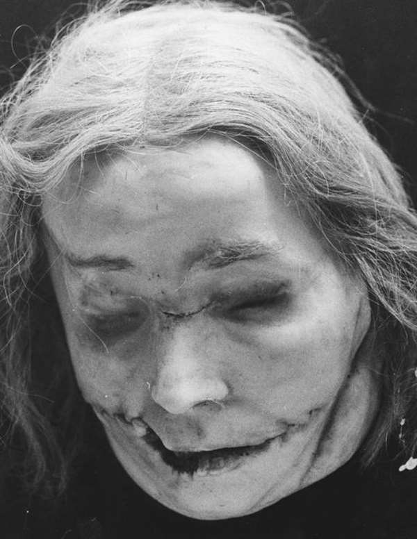 Anna Månsson som Dalman halshögg 1890. Hon vände något på huvudet så bilan tog snett över munnen på den dömda. Gipsavgjutning av huvudet. Månsson känd som ”Yngsjömörderskan” var den sista kvinnan att avrättas i Sverige.