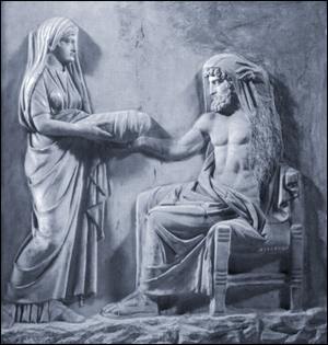 Gudinnan Ops överräcker en gåva till sin make Saturnus. Eller är det ett av gudens barn?