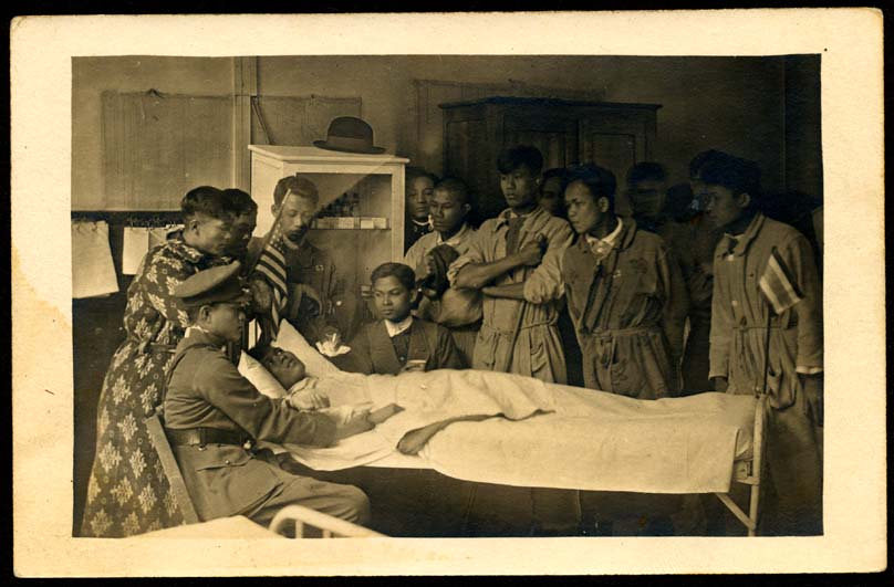En siamesisk soldat är sjuk och vistas på ett amerikansk sjukhus. Landsmän tittar till honom.