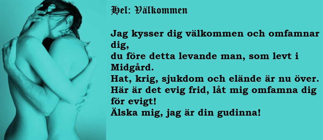 Vi levande ska inte hänge oss åt någon morbid dödskult. Vi dör ju för eller senare och vi får nog med döden då. Inte ska vi ägna oss åt ”livskult” när vi är döda. Men döden bör vi hedningar tänka på ibland och likaså konsten att dö. Sänd den mest mystiska gudinnan inom asatron en tanke då och då, liksom man ska sända en tanke till sina döda förfäder och vänner. Men försök att ha ett avslappnat förhållande till tillvaron efter livet. Det gör livet lättare att leva. Tids nog ler dödsgudinnan sitt vackraste leende mot dig.