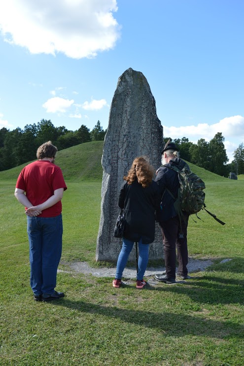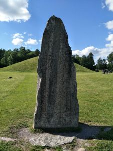 Den mäktiga runstenen vid Anundshög. Här finns runsten, gravhögar, skeppssättningar och mycket annat från hednisk tid. Platsen förstörde delvis av de kristna, men är nu vackert restaurerad.