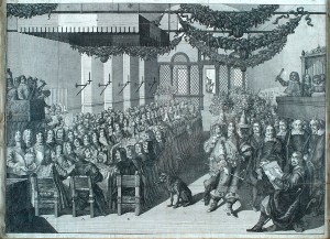 I mitten på kort sidan till vänster sitter Piccolomini med svenske tronarvingen Karl Gustav, senare kung med regentnummer tio och Karl Ludwig, av Pfalz. Sistnämnde son till den så kallade ”vinterkonungen” Fredrik av Pfalz som utsågs till kung när upproret 1618 började i Böhmen. Platsen är den stora fredsbanketten i Nürnberg 1649.