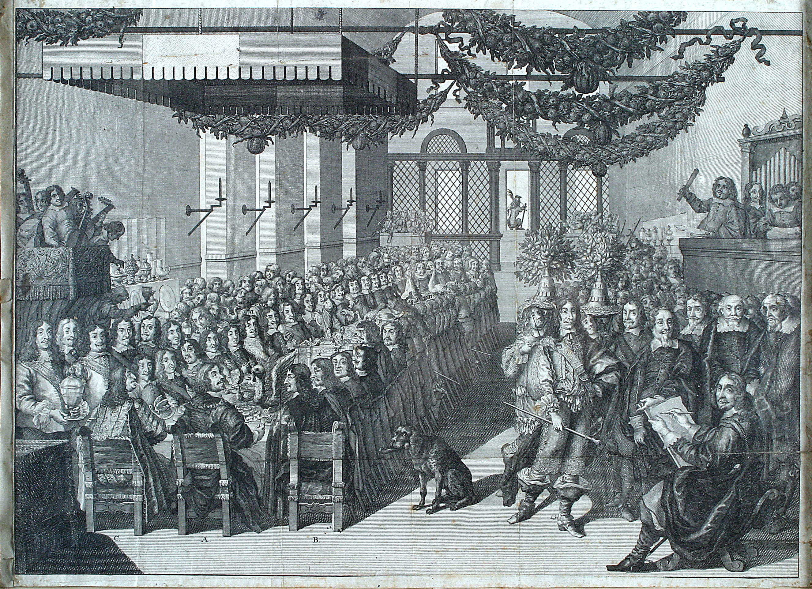 I mitten på kort sidan till vänster sitter Piccolomini med svenske tronarvingen Karl Gustav, senare kung med regentnummer tio och Karl Ludwig, av Pfalz. Sistnämnde son till den så kallade ”vinterkonungen” Fredrik av Pfalz som utsågs till kung när upproret 1618 började i Böhmen. Platsen är den stora fredsbanketten i Nürnberg 1649.