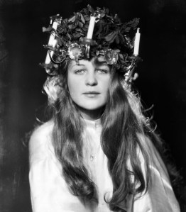 Sveriges ”första” Lucia, Solveig Hedengran. Notera de elektriska ljusen i kronan.