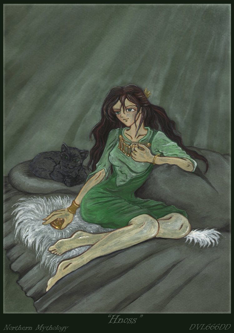 Systerdotter till Frej, barnbarn till Njord och syster till Gersemi är Hnoss. Odr och Freja är henens föräldrar. Hnoss är nog något mer känd än systern då Hnoss nämns i Ynglingatal, Snorres Edda samt i en namntula. Någon kult eller avbild finns inte av Hnoss från den förkristna tiden. Men asatron är ju i mycket och månt en poesins religion och Hnoss trivs utmärkt i skaldernas värld. Namnet kan nog översättas till ”klenod” och sköna damer benämndes förr hnossar. Att kärleksgudinnan Frejas döttrar är vackra säger sig självt. Freja härstammar från vanerna men Odr kommer från asarnas ätt.