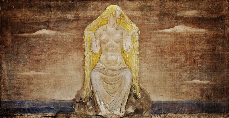 John Bauer målade många motiv från asatron. Fru Esther ska suttit modell till gudinna Freja. Måhända det är Vättern som syns i bakgrunden?