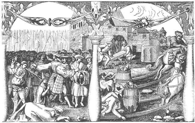 Detalj av de så kallade Blodbadstavlorna som Gustav Vasa lät göra några år efter blodbadet. Folk avrättas och deras huvuden läggs i tunnor. Kroppar och tunnor förs bort för att brännas.