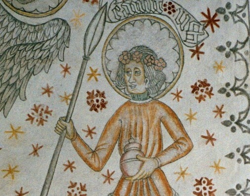 Kyrkomålning som föreställer Knut Lavard. Notera spjutet.