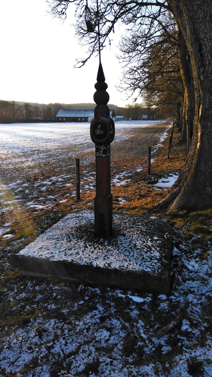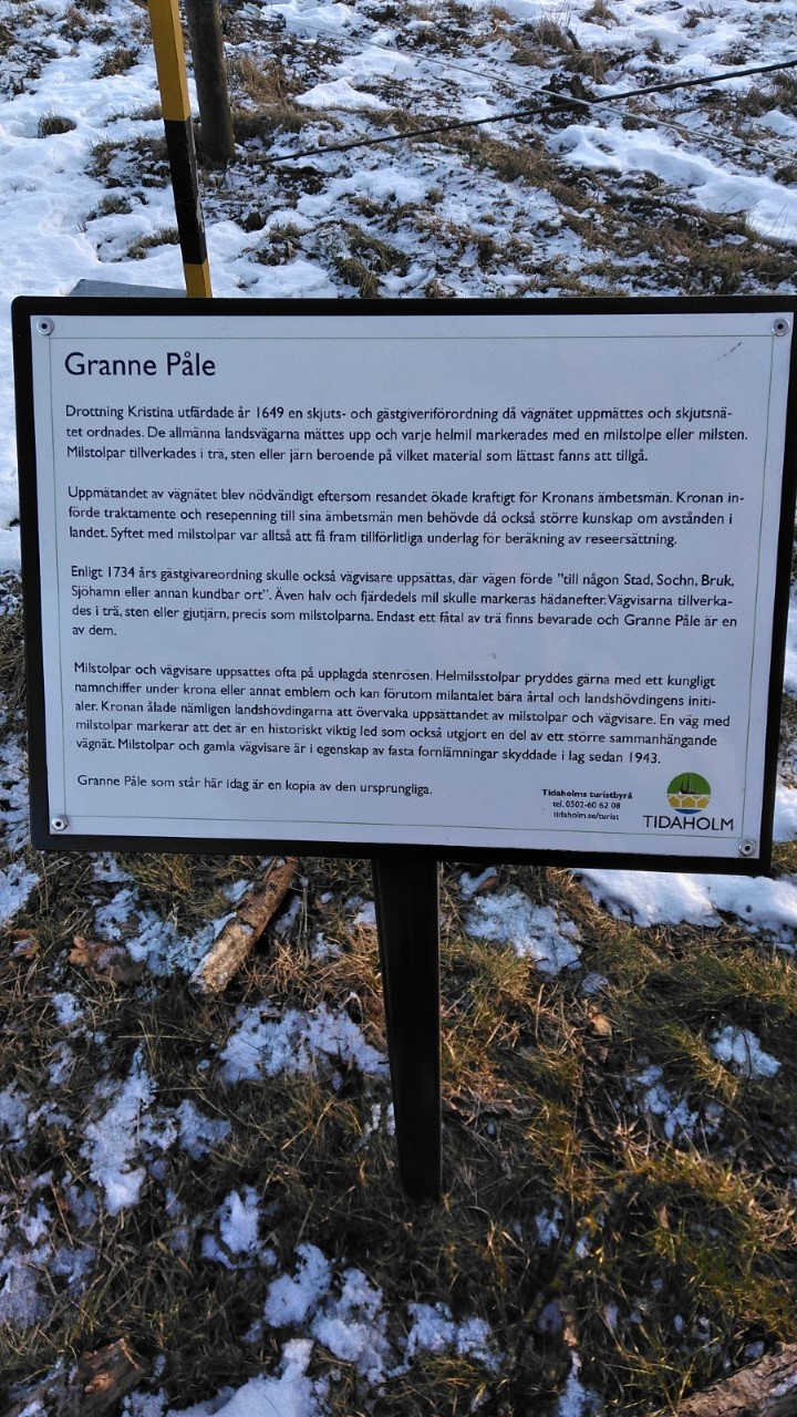 Vid ett vägskäl i närheten går vägarna åt fyra håll. Här står den rödmålade pålen med en krona på sig. Detta vägmärke har rötterna ner i 1700-talet och den förnyas vid behov. Texten är gammalsvenska och mot norr står det ”Wägen till Borgunda” texten på sydsidan lyder ”Wägen till Dimbo”, på västra sidan står det ”Wägen till Hvarf” och sutligen den på östsidan har texten ”Wägen till Acklinga”.
