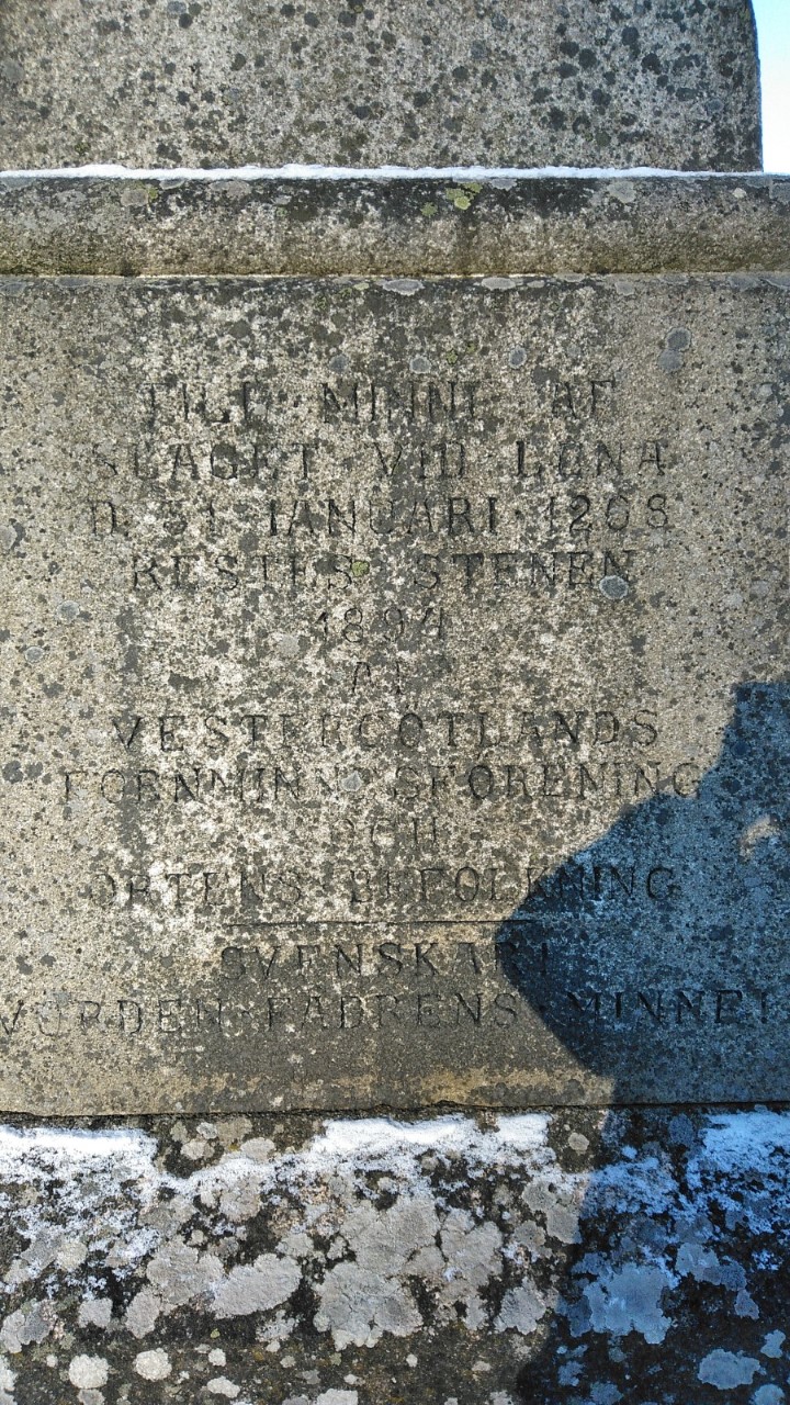 ”Till minne af slaget vid Lena d. 31 januari 1208 restes stenen 1894 af Vestergötlands fornminnesförening och ortens befolkning