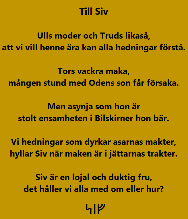 Siv är inte bland de mest kända av gudarna och gudinnorna som Oden, Tor, Frigg och Freja.. Men hon kan sägas komma bland de mer kända. Siv är med i eddans gudasånger hon är med i Loketrätan och nämns i sången om Harbard men Siv har troligen aldrig haft en egen kult. Hon är mor till betydelsefulla asar som dottern Trud och sönerna Ull och Mode, den sistnämnde överlever ragnarök. Siv kan gott uppmärksammas och äras mer. Hell Siv!