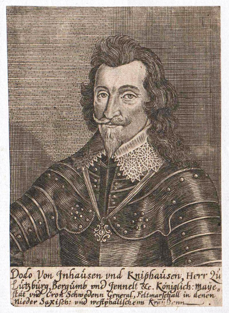 Dodo zu Innhausen und Knyphausen 1583-1636 Född i Ostfriesland, fadern friherre. Gick i Holländsk krigstjänst nitton år gammal. Stred under Moritz av Oraniens befäl mot spanjorerna. Befordrades till general men sårades svårt. Reste hem för att sköta sina sår. Gifte sig men fortsatte från 1615 som soldat. Gick i kurfursten Fredrik V av Pfalz tjänst när denne blivit kung av Böhmen. Stred för denne under 1620-talet. Dömdes till döden efter det katastrofala slaget vid Stadtlohn 1623 där den kejserlige befälhavaren Johann Tserclaes Tilly vann en stor seger. En ny rättegång frikände honom och han fortsatte strida. Togs till fånga efter slaget vid Dessau 1626 då han stred för danskarna men lyckades fly efter att ha varit fånge i mer än ett år. Reste till England efter att Danmark slöt fred och lämnade kriget. År 1629 inträdde Dodo zu Innhausen und Knyphausen i svensk tjänst och fick rang av generalmajor. 1631 hamnade han åter i fångenskap efter ha varit kommendant i staden Neubrandenburg som belägrades av kejsarens trupper, men blev efter en tid utväxlad. Inför slaget vid Lützen var han en av de som var motvillig till att strida, han ville invänta förstärkningar. Högsta befäl och ledare för den högra flygeln var kungen själv. Centern leddes av Nils Brahe och vänstra flygel av Bernhard av Weimar medan Knyphausen fick leda andra träffen eller reserven med ett moderna ord. När han fick underrättelse att kungen stupat yrkade han på att man skulle retirera men så blev inte fallet och Knyphausen bidrog till att slaget fick en för svenskarna lycklig utgång. Befordrades året efter till fältmarskalk. Segrade med en svensk här i förbund med trupper från Hessen och Lüneburg över en kejserlig här Oldendorf samma år. Dodo zu Innhausen und Knyphausen stupade för en kula vid Haselünne som träffade honom i huvudet. Trots detta lyckades hans trupper vinna striden.