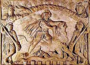 Mithra dödar tjuren. Cautes och Cautopates flankerar honom. Ovan Sol och Måne. Notera korpen. Korpen är ett djur som förknippas med såväl Oden som Mithra.