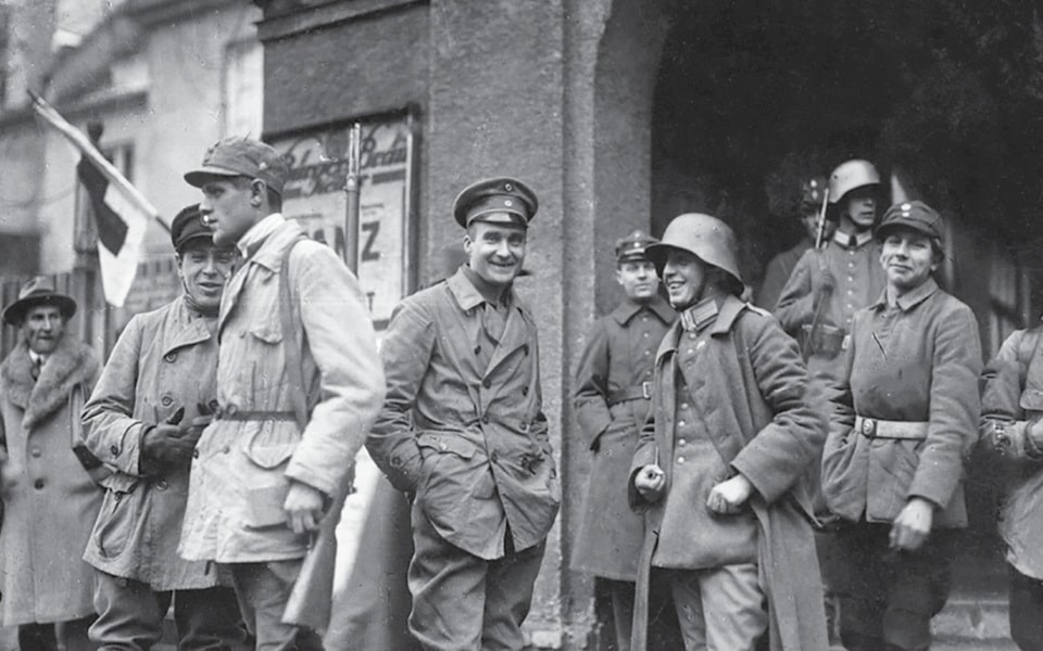 Medlemmar i kuppen som besatte krigsministeriet. Mannen med fanan och glasögonen är Heinrich Himmler som sedan blev ledare för SS.