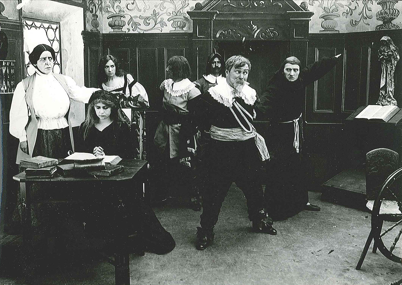 Huvudpersonerna Regina von Emmeritz och kungen spelades av Gerda André och Emile Stiebel båda ursprungligen sångare men den konsten hade de nog ingen nytta av i en stumfilm. Många av de medverkande var anlitade vid Operan och Dramaten och det påpekades när man gjorde reklam för filmen. Vidare ska nämnas Carl Browallius som spelar skurken munken Hieronymus. Det var Svenska Bios största satsning och speltiden var 44 minuter. Dessvärre så är filmen förkommen.