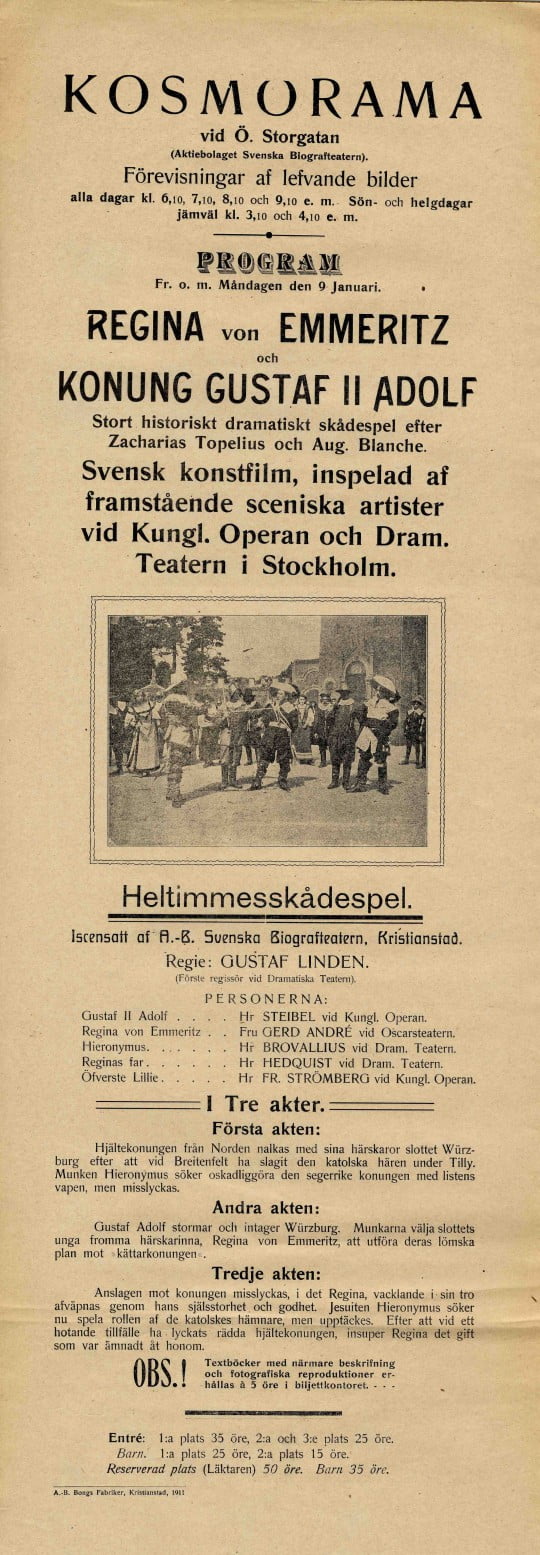 Har inte Gustav II Adolf varit föremål för filmmakarnas intresse? Jo det har hjältekonungen, men det var ju inte så nyligen om man säger så. Men 1910 gjordes en film som premiärvisades lämpligt nog i november med titeln ”Regina von Emmeritz och Konung Gustaf II Adolf”. Med inspiration av Zacharias Topelius historieromaner gjorde regissören Gustaf Linden filmen. August Blanche också han en för de flesta känd författare ska ha inspirerat till filmen men det är nog oklart vad detta ska bestå i då det är Topelius verk som användes. Manuset skrev av Erik Jungberger. Filmfotograf var Robert Olsson. Filmen inspelades i Skåne och Malteholms slott är med i filmen. Kristianstad var under några år den plats i Sverige där flest filmer spelades in och producerades.