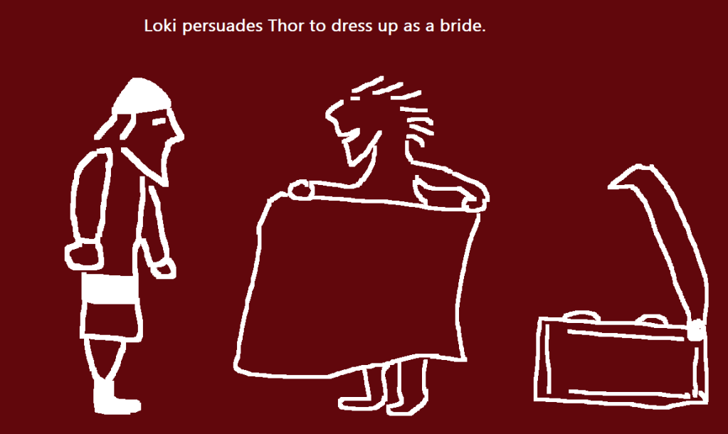 Motvilligt, mycket motvilligt lät Tor övertala sig att klä ut sig till brud. Men ibland så måste även gudar förödmjuka sig. Förebrå inte Tor detta. Han svalde stoltheten och rädda världen ty jättarna hade segrat om Mjölner inte kommit åter till asarna. Nu vill illvilliga åter rycka ifrån åskguden hans hammare.