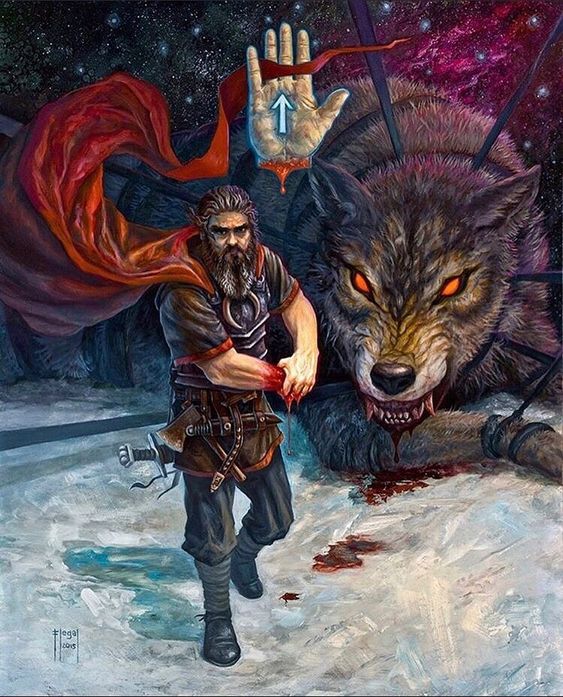 Tyr binder ulven. När Fenris inser att han är fånge biter han av Tyr handen. Men Tyr hämnas inte. I Loketrätan när Loke påminner Tyr om att han mist sin hand svarar denne: