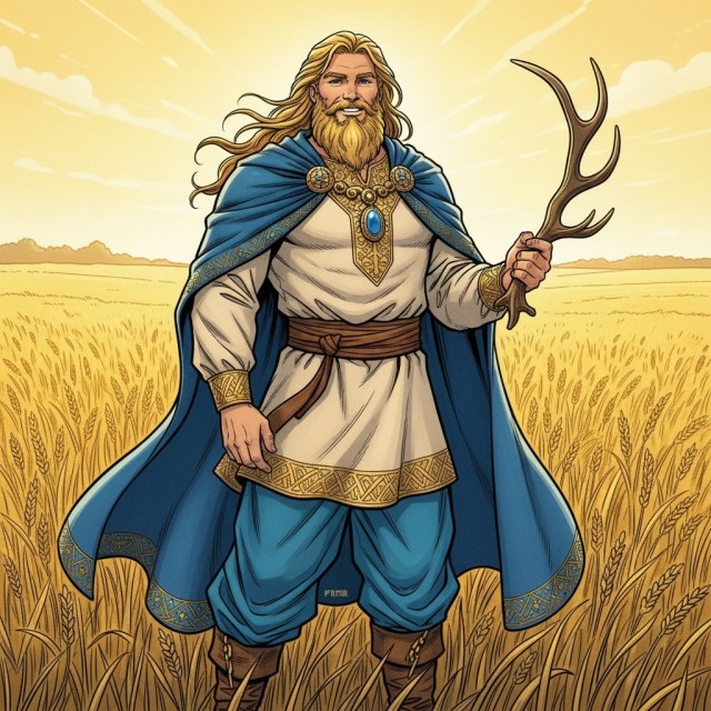 Inget svärd har sonen till Njord ett lätt byte tänkte Bele. Kamp ska stå strid ska utkämpas kom och du törs alvernas furste. Till strid kom vanen ej med spjut ej med yxa vapen blott ett horn. Men Bele skulle ej mer skatta ty till Hel han for hjortens krona var Frejs vapen.